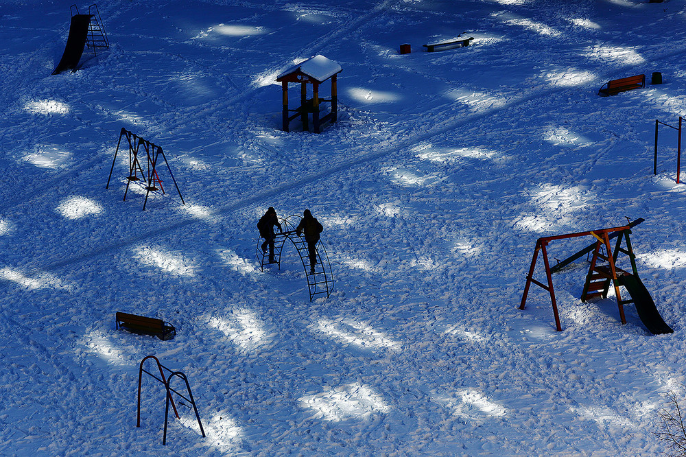 Репортажный снимок. Подростки играют на детской площадке в одном из спальных районов Южного Урала. Простые архитектурные формы сыграли красиво при необычном свете.
