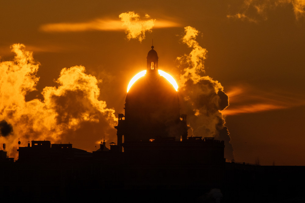 Фотографировать архитектуру Санкт-Петербурга и совмещать ее с природными явлениями отдельное удовольствие. Кроме выбора объекта необходимо еще правильно рассчитать траекторию движения Солнца, Луны. Найти точку, где они наложатся друг на друга желанным образом. Я давно хотел совместить рассветное солнце с куполом Исаакиевского собора. И вот мне повезло сложить все составляющие в одном кадре.