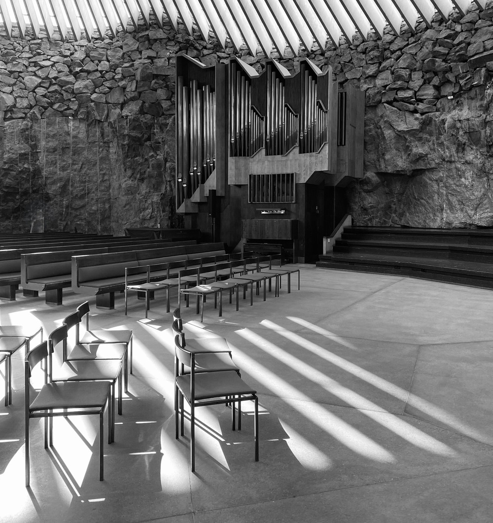 Геометрия линий рядов стульев, труб органа, срезов скалы соединяется здесь в единый ритм, заставляя сомневаться, где заканчивается природа, а где начинается совершенный замысел человека и звучит музыка.
