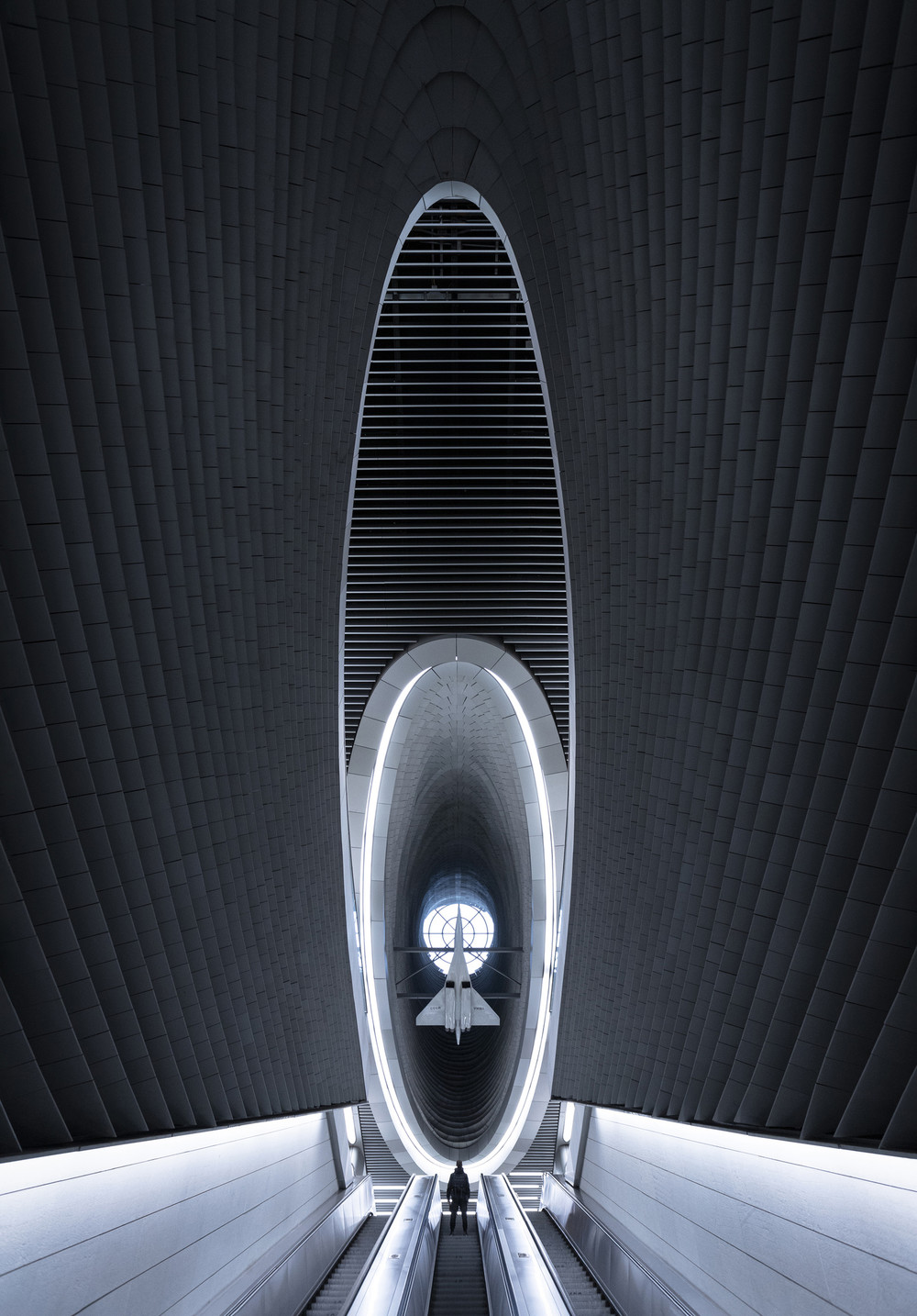 Современное московское метро не перестаёт удивлять. Пыхтино - не просто станция, а иллюзия полёта. Своды сходятся в световой портал, линии ускоряются, пространство сжимается до точки, где застывший самолёт становится символом движения. Здесь нет суеты - только чистая геометрия, свет и ощущение, что путь уже начался, даже если ты ещё стоишь на эскалаторе