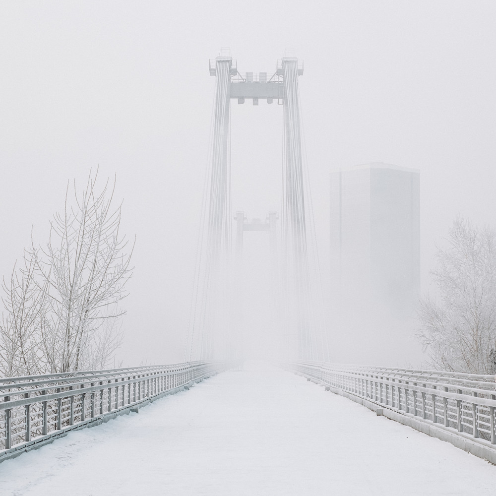 Мне очень нравится этот мост. Я люблю его архитектурность, чистые линии, ритм тросов, симметрию. В обычные дни он наполнен людьми, движением, звуками, кругом кипит жизнь. Но я сняла его по другому - зимой в -35, весь покрытый инеем, в эти зимние моменты он превращается в совсем другой мир - безвременный, бесшумный, будто вынесенный за пределы города и суеты.