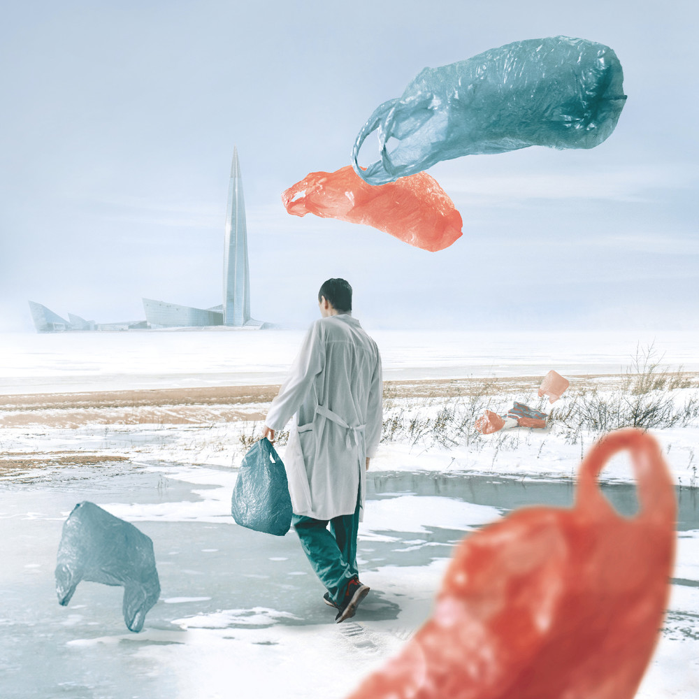 Мой фотоколлаж «Мусорный ветер» представляет собой гиперболизированное размышление о будущем, которое наступит уже завтра. Архитектура здесь выступает как символ технологического прогресса — Лахта Центр на заднем плане становится тем самым «фасадом совершенства», за которым скрываются нерешённые проблемы города. Человек с пакетом на льду Финского залива и летающий мусор создают постапокалиптическую атмосферу, контрастирующую с идеальным фасадом здания.