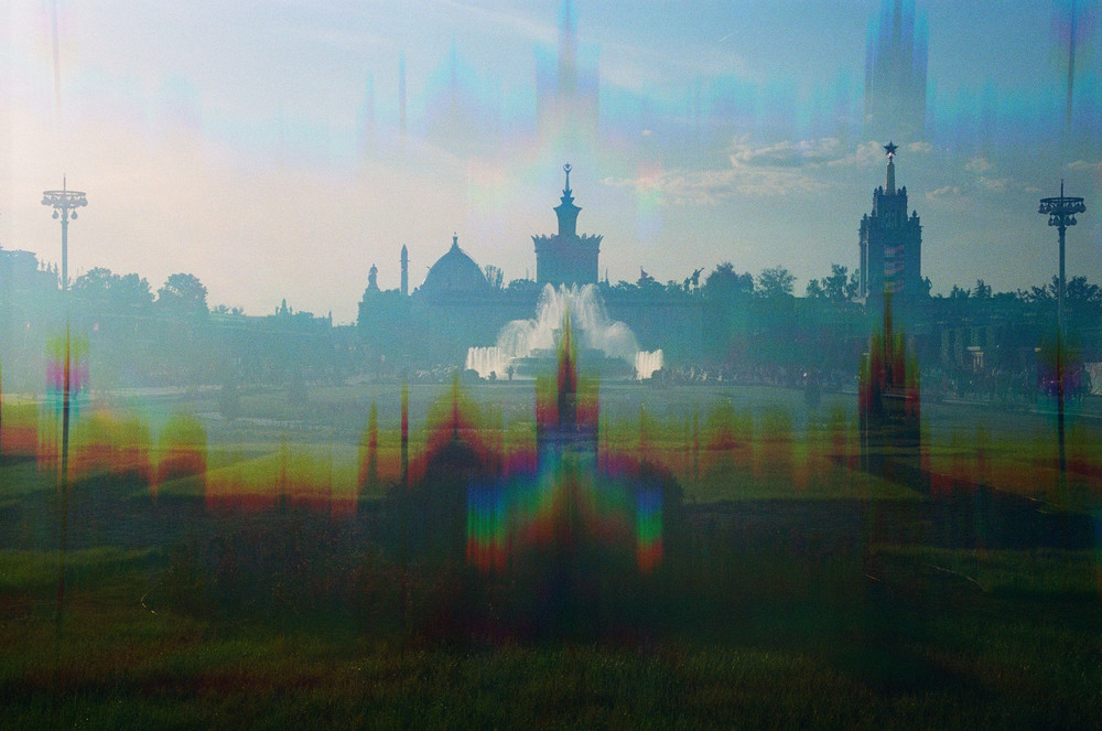 Архитектура - это всегда отражение времени. ВДНХ - это площадка где архитектура наглядно показывает течение времени и с момента закладки выставки ВСХВ в 1935г. является главным инструментом создания иллюзии города солнца и изобилия. Фотография осевой перспективы одной из главных площадей ВДНХ демонстрирует в контровом свете линию горизонта силуэтов павильонов разного времени устремленных вместе с ракетой-носителем «Восток» вверх, в будущее. Вертикальную линию движения в верх усиливает оптический эффект фильтра, создающий необходимую динамику и раскладывающий горизонт на 3 составные части, подобно трем законам Витрувия - пользе, прочности, красоте…. Метод съемки: аналоговый