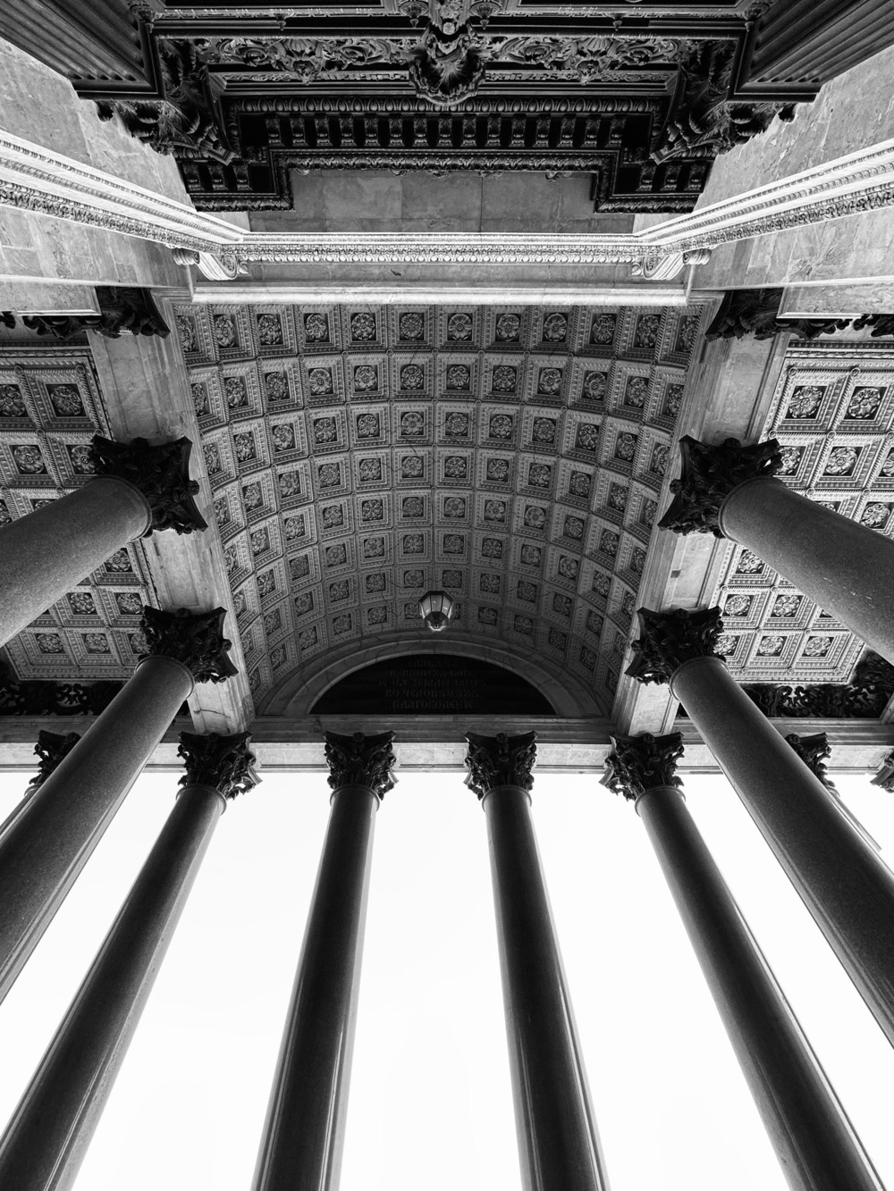 Идея была в том, чтобы изменить восприятие парадной. С низкой точки ракурса сфотографировала потолок, захватив кусочек входной двери и конечно колонны, которые кажутся бесконечными)