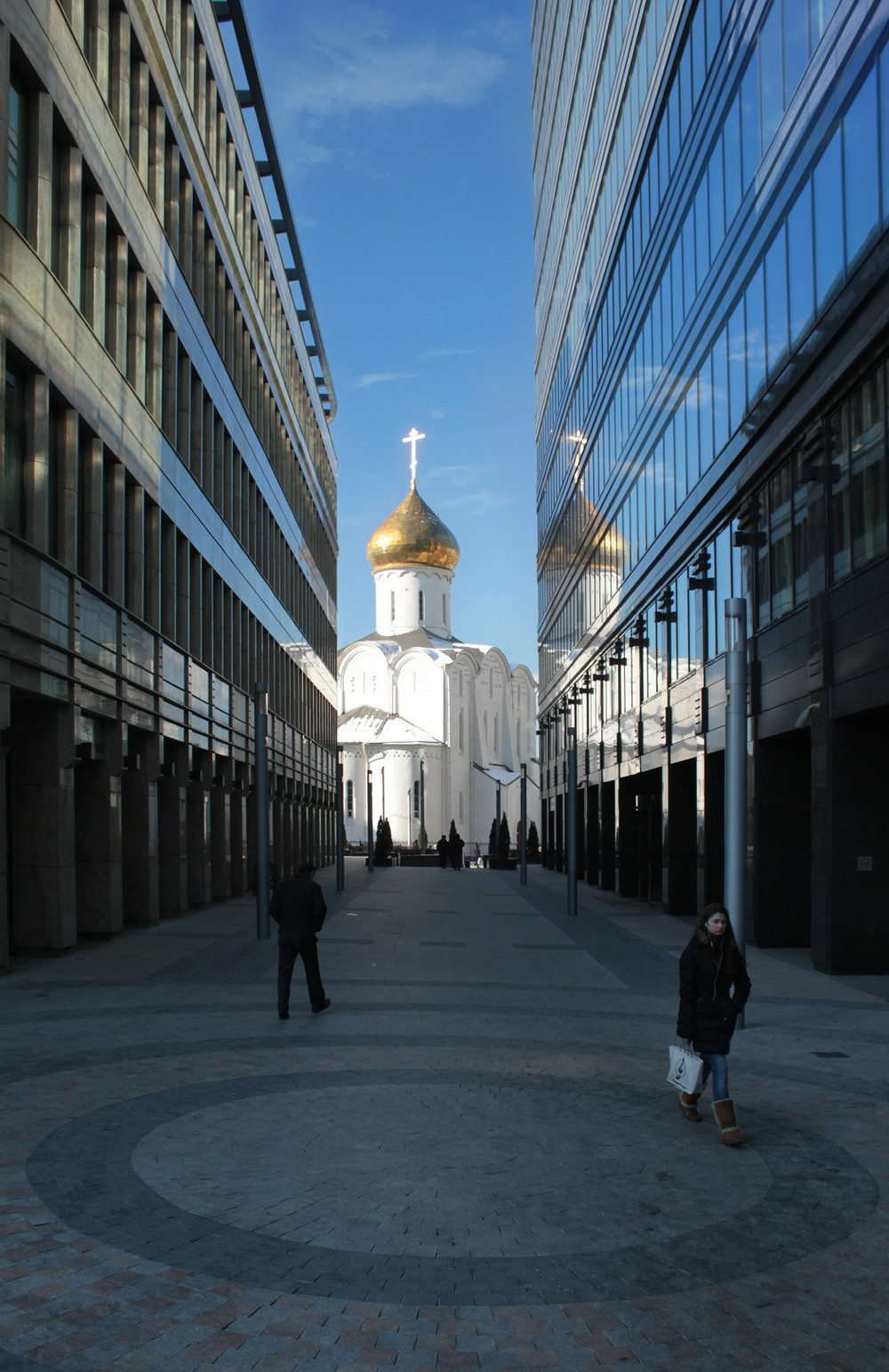 Фото сделано в городе Москва прогуливаясь в солнечный морозный день понравился кадр, как архитектура объединяет модное и вечное.