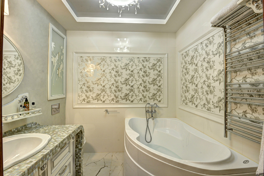 Классический стиль интерьера ванной комнаты был решен необычной цветовой гаммой. Игра на нюансных оттенках казалось бы скучного серого цвета, завораживала в процессе работы. Вдохновением стали сделанные в классическом исполнении керамические панно в багетах фабрики Peronda. Игра текстур веницианской штукатурки на стенах и мозаики с авантюрином от фабрики Bisazza усложнила значимость цвета и придала ажурность пространству. Авторы проекта: Бочкова Оксана и Кондратьева Ольга. Проект 2012 года. Фотограф: Бочков Денис