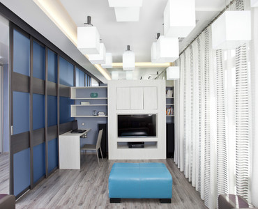 Кухня-гостиная представляет собой трансформируемое пространство. Главный акцент гостиной - сложная геометрия потолка в сочетании с разноуровневыми светильниками. Зеркальное полотно расположенное над стеллажами отражает многоуровневый потолок, усложняя архитектуру помещения.