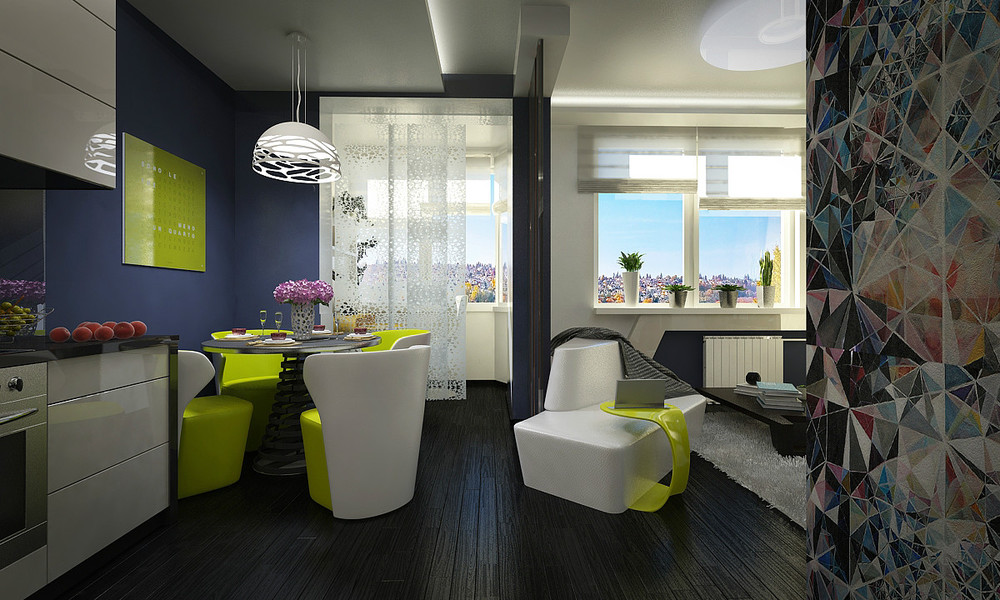 Хозяин квартиры - молодой человек. Его жизнь наполнена и разнообразна: современные достижения техники, скорость сообщения, расширение границ мира. Все это напоминает калейдоскоп из кусочков стекла. Эта идея и послужила вдохновением для проекта квартиры. Фон квартиры нейтральный белый. Пространство студии поделено на 3 зоны: кухню-столовую, гостиную и спальню. Каждая из зон выделена своим мотивом. Гостиная светлая, всегда готова к гостям, общению и веселью. Кухонная мебель выполнена в лаке цвета топленого молока. Для того, чтобы выделить мебель и отделить зону кухни от гостиной введен темно-синий «мужской» цвет стен в кухне. Яркие цвета кресел и аксессуаров разбавляют графичное решение интерьера и создают позитивное настроение. Мебель для квартиры современная, частично выполнена под заказ. Отдельный элемент дизайна квартиры – художественное панно. Это и есть разноцветный калейдоскоп. Он будет служить напоминанием хозяину о том, что за суетой можно потерять потерять главное в жизни.
