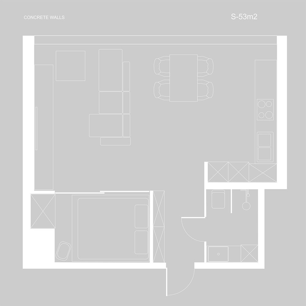 Однокомнатная квартира площадью 53 м.кв, в новом строящемся доме “Огни Екатеринбурга”Апартаменты для молодой пары. Минимальные вмешательства в существующую планировку, минимум декора и максимальное использование пространства.