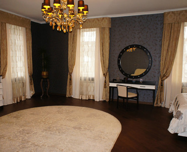 Женская спальня. Цветовое решение, орнамент штор, обоев и мебель ручной работы создают элегантность интерьера и атмосферу спокойствия. Проект сдан 2012 году. Фотограф Виктория Трофимова.