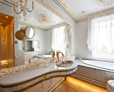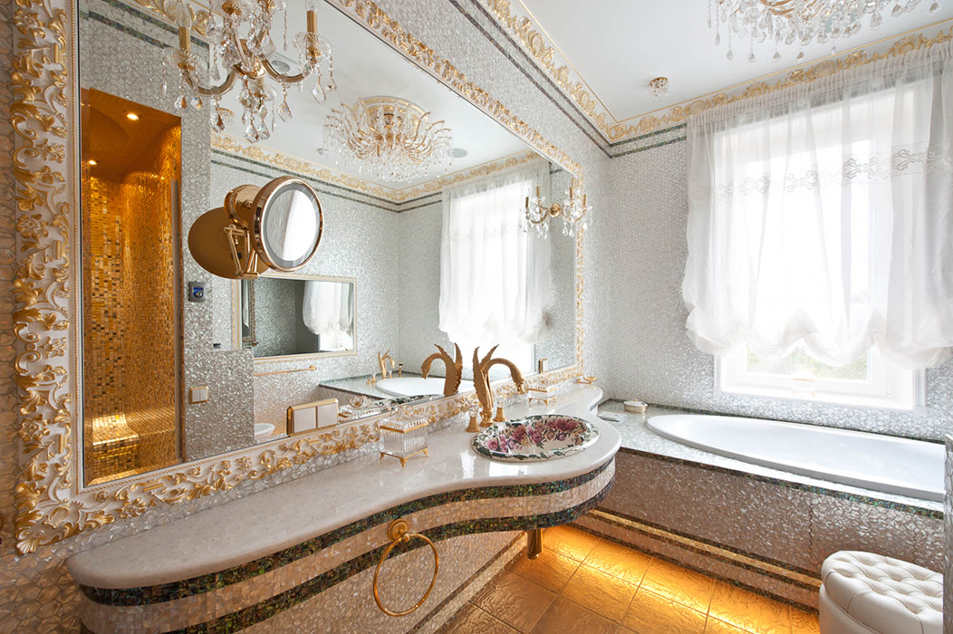 Ванная комната хозяев, в элитном жилом комплексе, в 5 минутах от Кремля. Стены отделаны натуральным перламутром двух видов, речным и морским. Лепнина на потолке с позолотой. Душевая кабина-мозаика.