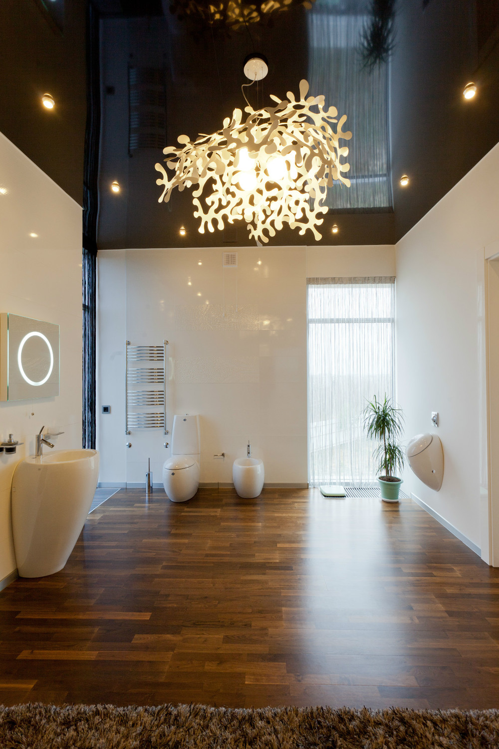 Основной тон в оформлении ванной комнаты задала выбранная плитка с орнаментом напоминающим коралл, ей вторит орнамент на стеклянной душевой перегородке и люстра.