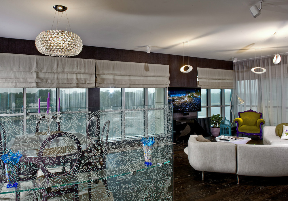 Интерьер квартиры /165 м2/ на Песочной набережной в Санкт-Петербурге разработан архитектурной студией StudioKORA для молодой пары, имеющей вкус и интерес к путешествиям, и желающих создать жилье с возможностью смены впечатлений от комнаты к комнате. Спасибо им за смелость, желание быть индивидуальными и не побоявшимся разности стилевых впечатлений стиля "постмодерн". Cобственно, именно смена стилевых впечатлений от комнаты к комнате и пространствообразующий волнообразный элемент пластичной стены гостиной, и послужили отправной точкой для оригинального концептуального решения интерьера. Основное пространство квартиры объединяет кухню, столовую, гостиную и имеет тот самый индивидуальный элемент в виде пластичной стены, создающей эффект металлической шторы или эффект волны. Стена изготовлена в Италии /D1 interior/ из MDF по индивидуальным чертежам и покрыта тонким слоем металла способом гальваники на дерево, за счет чего имеет легкий вес. Помимо эстетики, стена имеет и функцию, скрывая объемы хранения по всей плоскости стены с внутренней стороны.Интерьер спальни носит более классический характер и укомплектован мебелью и аксессуарами итальянских производителей.Спальня: Savio Firmino, свет Foscarini Гостиная: Диван Minotti, столик и комод под ТВ Cattelan, кресло Moda, торшер у кресла и светильники в зоне гостиной Artemide. Кухня: Cesar, столешница Corian, Светильники Artemide. Столовая: Luciano Zonta, свет Foscarini Стеклянный бар в гостиной и роспись в прихожей: индивидуальное изготовление петербуржской художницы Елены Майер. Прихожая: Cвет Linea Light, Fabbian Ideal, Lux, пуф Creazioni и тумбочка Moda, Гардеробные Poliform Сантехника: Duravit, Antonio Lupi, смесители Gessi Дизайнер Анна Першукова /архитектурная студия StudioKORA/ в сотрудничестве с Анной Гришановой /студия декорированияА2/, при участии Антона Галина. Год реализации 2013. © Фотографии Георгий Шабловский