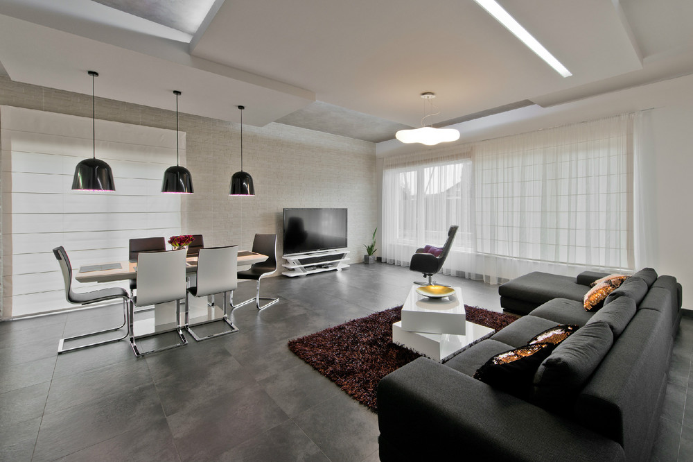 Философия этого интерьера - тонкий баланс между строгости и чистоты минимализма и гламурной элеганции. Изысканный характер интерьера раскрывает сильная геометрия, комбинация интересных текстур и гармония сиреневых и серых оттенков. Естественные и искусственные источники света преобразуют пространство и подчеркивает её красоту. Общая площадь: 266м2. Год реализации: 2014. Фотограф: Леонас Гарбачаускас.