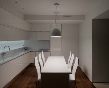 "Для меня самое главное - это комфорт и уют!" - так говорят и просят практически все заказчики. Задача данного объекта не была исключением. Но для каждого человека эти слова имеют разное воплощение в реальности. Проведя подготовительные работы было согласовано применять в интерьере исключительно натуральные материалы, сочетая их между собой в пространстве квартиры таким образом, чтобы создать ощущение равновесия и добиться симбиоза разных материалов. Как в природе когда гору разбивает водопад, так и в этой квартире большая масса мрамора переходит с пола на стены душевой кабины, и когда включается вода создается ощущение себя под настоящим водопадом. Как в природе когда на скалах пробивается лес, так и здесь из пола натурального камня вырастают деревянные изделия на заказ. Таким приемом решено все пространство этой светлой квартиры. Одним из самых интересных решений в этом дизайне является фартук кухни. Он выполнен из whiteglass в виде lightbox, что позволяет использовать всю площадь фартука как светильник. Это было сделано для того, чтобы кухня имела освещение, как естественное так и искусственное, потому как по планировке естественный свет в кухню не проникает, к ней примыкает кабинет. В солнечные дни, свет из кабинета попадает через lightbox на рабочую поверхность кухни, в темное время суток lightbox подсвечивается. Такой ход позволяет наполнить кухню светом во всех уголках. Проект реализован в 2013 году. Авторы : "архитектурное бюро - А2Т" - Томашенко Александр, Назарова Ольга. Фото - Илья Иванов.