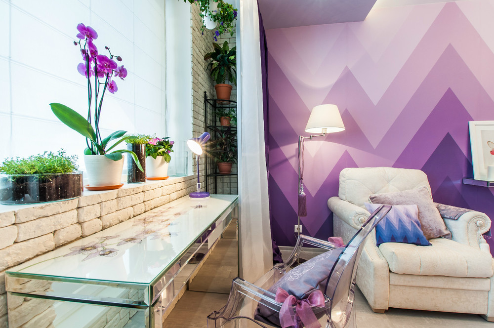 Работа сделана в рамках проекта для программы "Школа ремонта". Хотелось по экспериментировать на тему фиолетового цвета и стилей в орнаменте. Обои в стиле арт-деко, зиг-заг с градиентом фиолетового в сочетании с классическими вензелями цветов. Геометрию принтов обоев, поддерживают принты на подушках зиг-заг. В целом мне показалось интересным создать столкновение одного цвета, фактур и орнаментов. Столкновение цвета может проходить в рамках одного цвета и его градиента, этим я и хотел выразить один из трендов Heimtextil 2014/2015 "Progress!" , а именно "Generate Collision!". Я хочу донести до вас что сталкивать можно не только разные цвета друг с другом, но и один цвет в рамках его оттенков, это гораздо тоньше и интереснее )