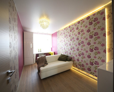 Отделка паркетной доской зоны гостиной позволяет создать особенно уютную атмосферу. Белые лаковые фасады системы хранения на фоне натурального дуба не кажутся сверхсовременными, а наоборот, подчеркивают теплоту дерева и напоминают декор в стиле 60-х. Уют также создают акцентные предметы декора и текстиля. Ощущение стиля ретро поддерживают обои, светильник и скамейка в прихожей. В зоне кухни пол выложен белой плиткой, а одна из стен декорирована черным стеклом, нарочито подчеркивающим белоснежный глянец кухонных фасадов. Такое сочетание "холодных" фактур лака, стекла и камня в купе с закругленными углами стен, потолка и мебели делают интерьер футуристическим.