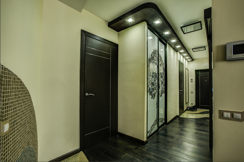 Работа над этим проектом строилась вокруг водной тематики: и хозяев, и дизайнера вдохновил чудесный вид на реку, открывающийся из окна. Так что убранство квартиры неслучайно рождает ассоциации с интерьером роскошной яхты… А еще о воде напоминают волнообразные линии мозаики, песочный цвет и рельеф декоративной штукатурки, золотисто-солнечный отлив плитки, ветви деревьев, в тени которых можно укрыться от палящего солнца, кристально чистая вода, струящаяся по стенам ванной комнаты. Планировка квартиры была изменена с учетом всех пожеланий хозяев, главной же идеей стало разделение пространства на гостевую и приватную зоны. Большое объединенное пространство кухни-гостиной, к которой примыкает коридор с гостевым санузлом, было отделено радиусной перегородкой от приватной зоны родителей – спальни и ванной комнаты. Результат – не только эргономичное, но и психологически грамотно организованное пространство. Общая площадь квартиры 130 м2. Год реализации: 2012 г. Фотограф: Полушкина Ирина.
