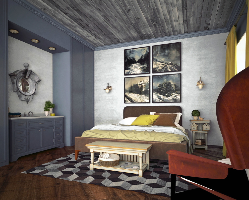 В гостиной композиционной доминантой стала стена с бараньими черепами, над которыми размещено на потолке световое панно, очерченное по контурам широкими полосами из брусьев. Этот уголок станет отличным местом для чтения книг и созерцания пламени камина Dimplex Bingham.