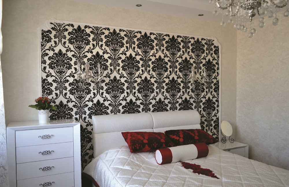 Тюль выбрали с крупными дамассками чтобы повторить рисунок обоев у зоны кровати, также этот дамасск мы повторяем на подушках и аппликациях на покрывале, которые являются самым ярким пятном в интерьере, поскольку в стиле Ар-Деко очень важны акценты.