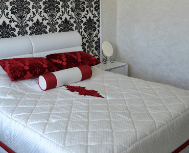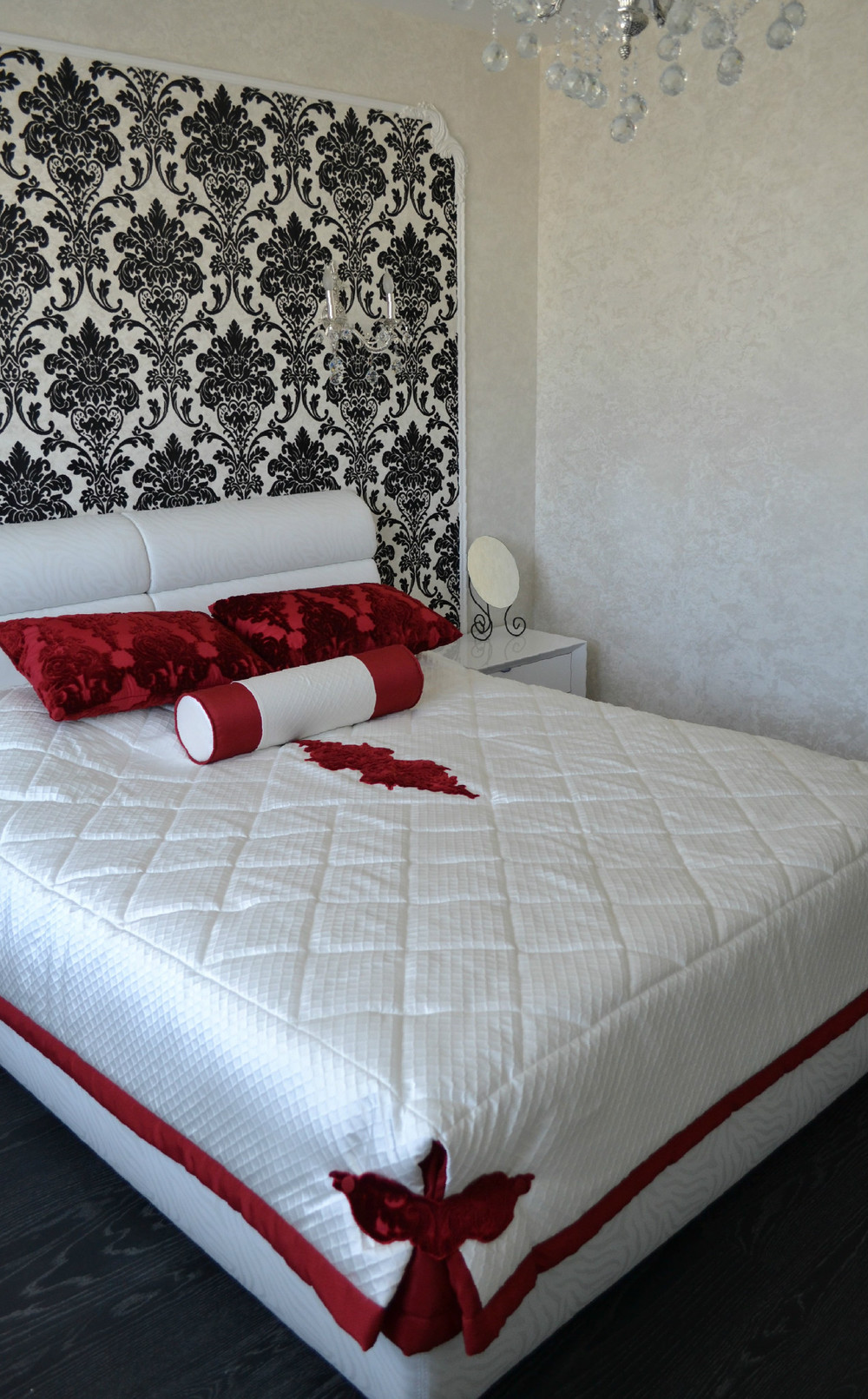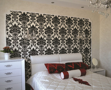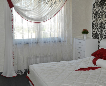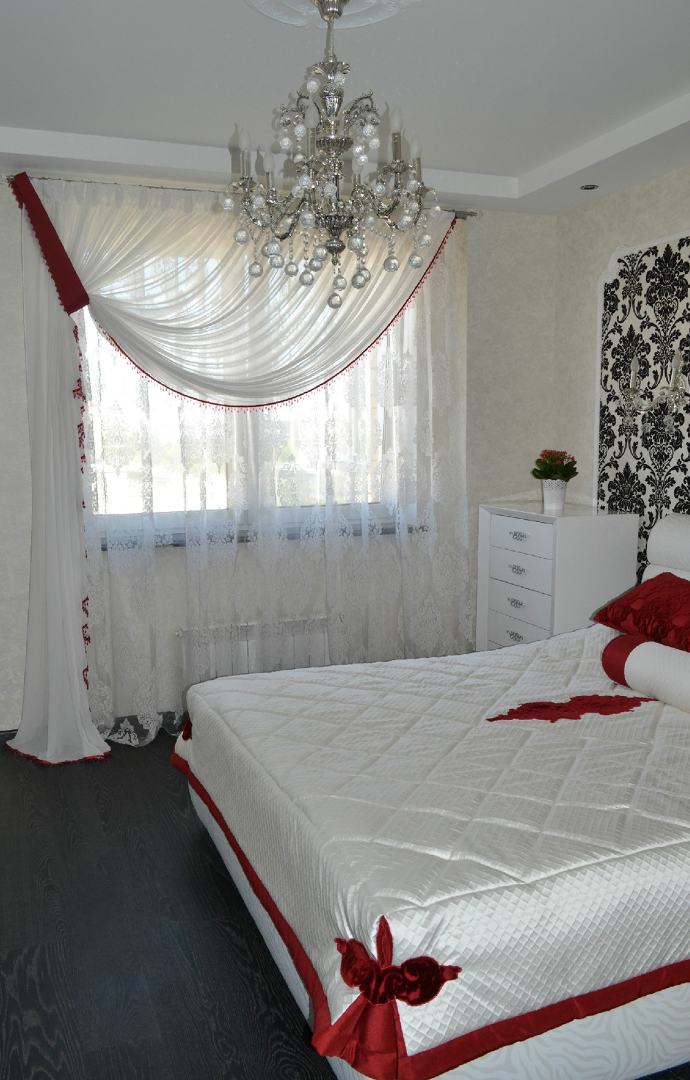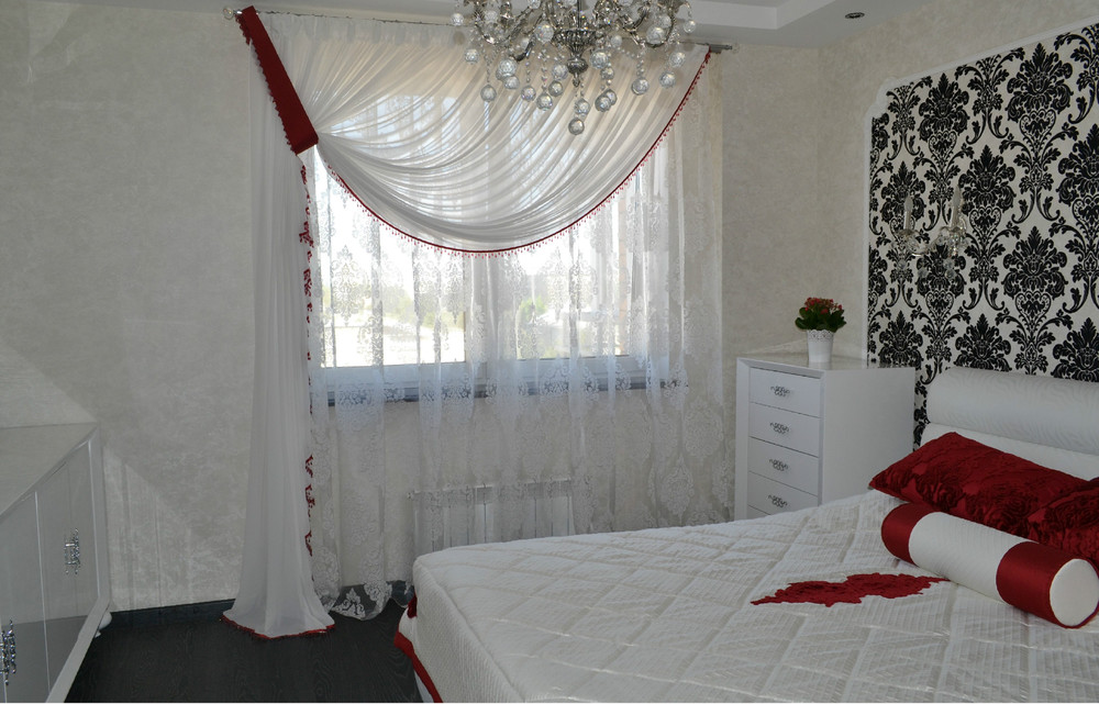 Светлая спальная комната в стиле Ар-Деко, которая передаёт яркую чистоту. Проект был разработан и осуществлён коллективом салона штор «Мир Желаний» в 2014 г. Нашим объектом была светлая спальная комната, общей площадью в 14 кв.м. Для того чтобы сохранить эту чистую атмосферу, мы решили сделать шторы в сочетании с покрывалом тоже белого цвета, но с небольшими благородно-бархатными акцентами брусничного цвета. Контурная линия из стекляруса подчёркивает декоративную однотонную штору, которая падает элегантно на пол. Тюль выбрали с крупными дамассками чтобы повторить рисунок обоев у зоны кровати, также этот дамасск мы повторяем на подушках и аппликациях на покрывале, которые являются самым ярким пятном в интерьере, поскольку в стиле Ар-Деко очень важны акценты. Наши шторы придали особый уют, а карниз в сочетании с люстрой поддержал общую концепцию интерьера. Фотосъёмку проводил: Борисов Александр Анатольевич.