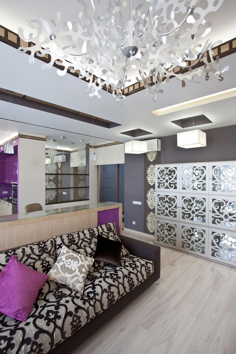 Квартира 106 кв.м. для супружеской пары средних лет, находится в монолитно-кирпичном доме-новостройке. Интерьер получился во всех отношениях эксклюзивным: часть мебели, декоративные элементы из дерева и стекла выполнены на заказ по нашим чертежам. Крупная вязь золотистых узоров на обоях и дверцах шкафа (прорезных), на обивке дивана, а также причудливый силуэт люстры соседствует с простой геометрией мебели, линейным декором потолка и пола. Год реализации проекта 2012. Фото: Евгений Кулибаба