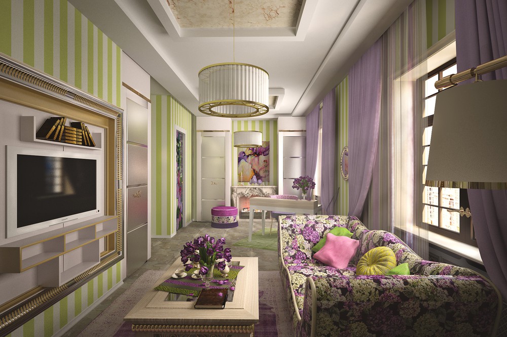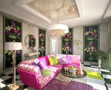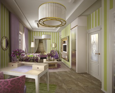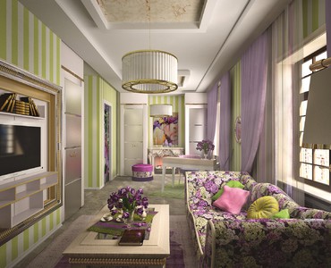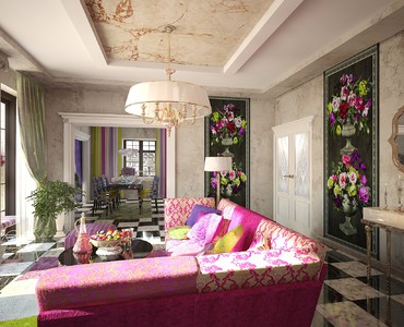 Пятикомнатная квартира с терассой оформлена с использованием обоев и тканей фирмы Designers Guild. Межкомнатные двери и порталы фирмы Волховец.