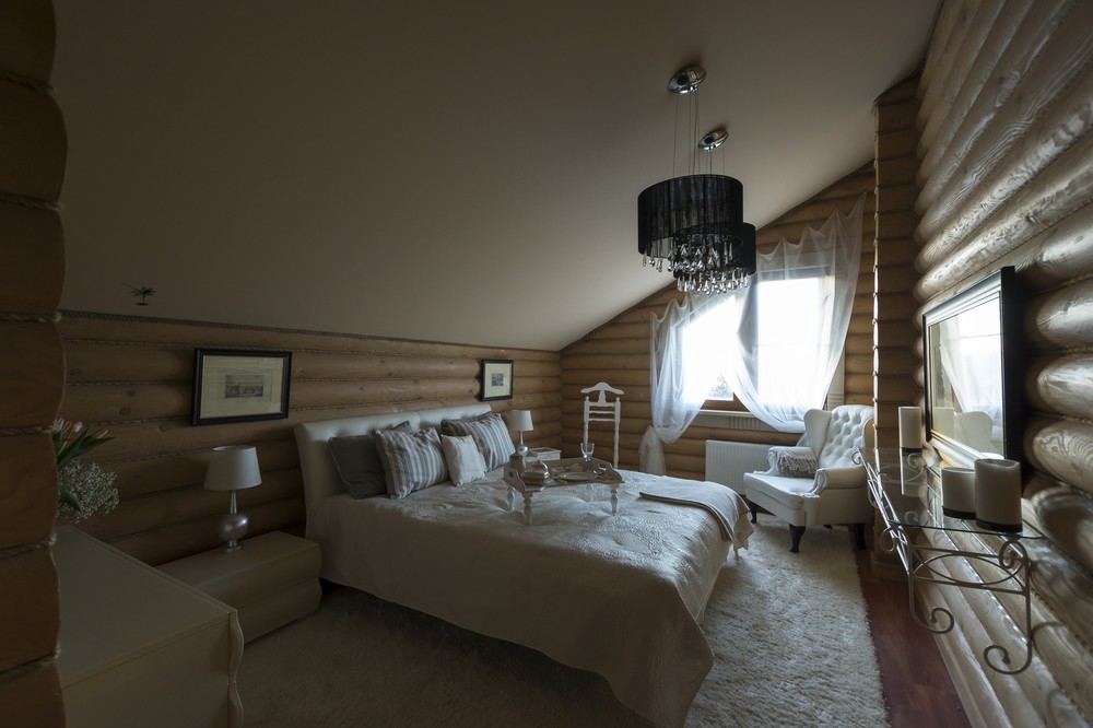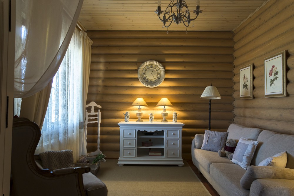 Из входящих данных: 2 х этажный сруб из круглого бревна, рыже-коричневый пол, шоколадные стеклопакеты с белыми наличниками. И нужно было это как-то быстро и эффективно сделать красивым, удобным и самое главное - уютным.
