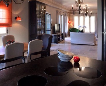 Кухня Islamorada от Marchi Cucine (Италия). "Остров", покрытый черным сланцем (из которого сделана рабочая поверхность кухни и "фартук"), и обеденный стол из дуба выполнены по эскизам декоратора. В "остров" интегрирована варочная панель, в потолок - вытяжка. Холодильник спрятан в шкаф. Техника Miele. Стулья и кресла - от JNL. Люстра и бра - от Judeco. Год реализации проекта - 2013. Фотограф Frank Folle.