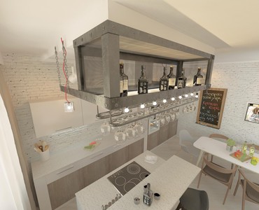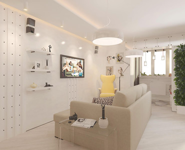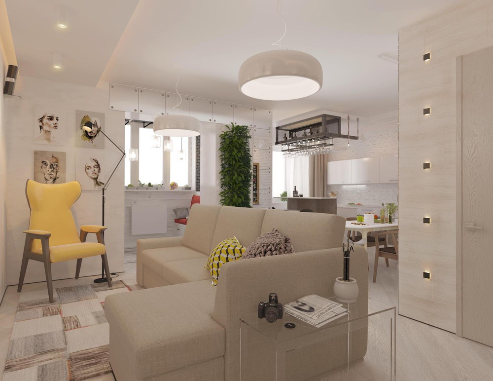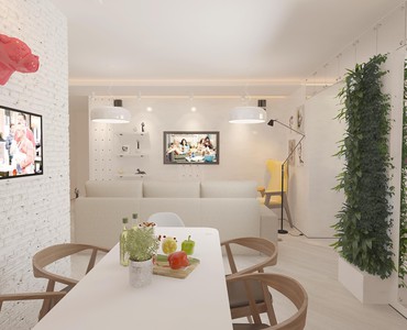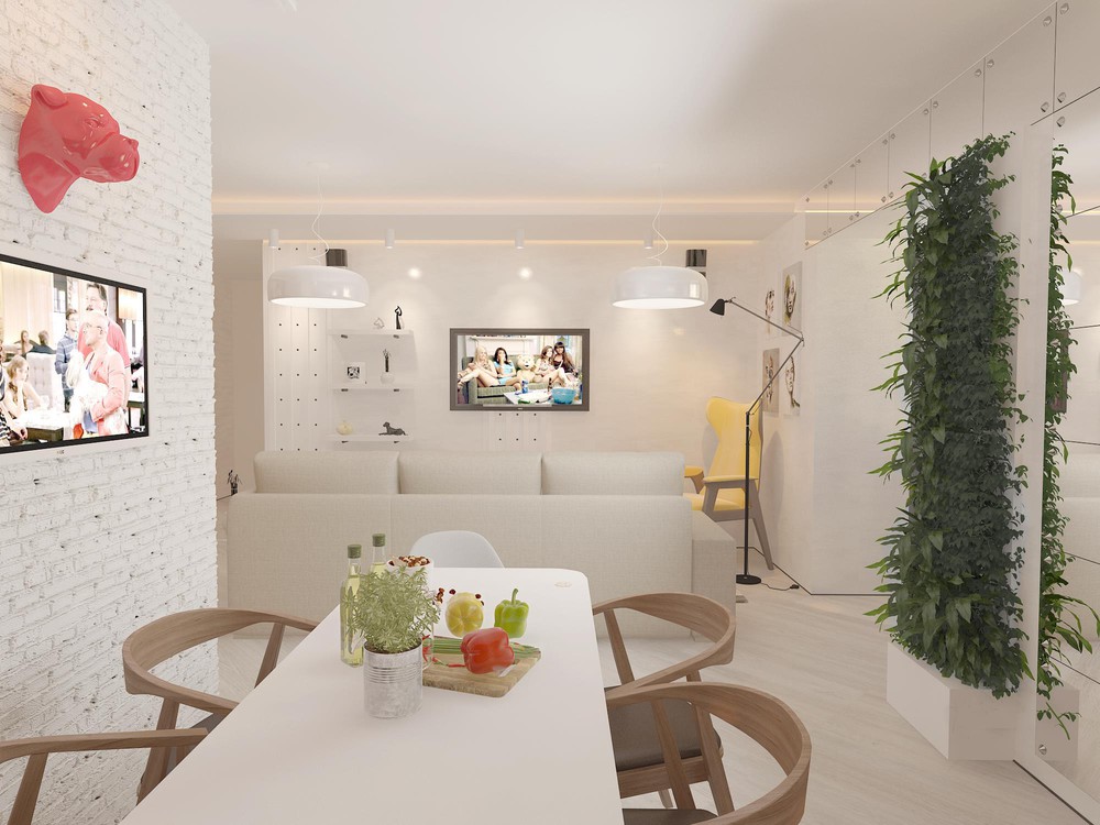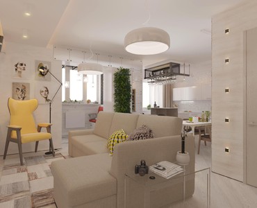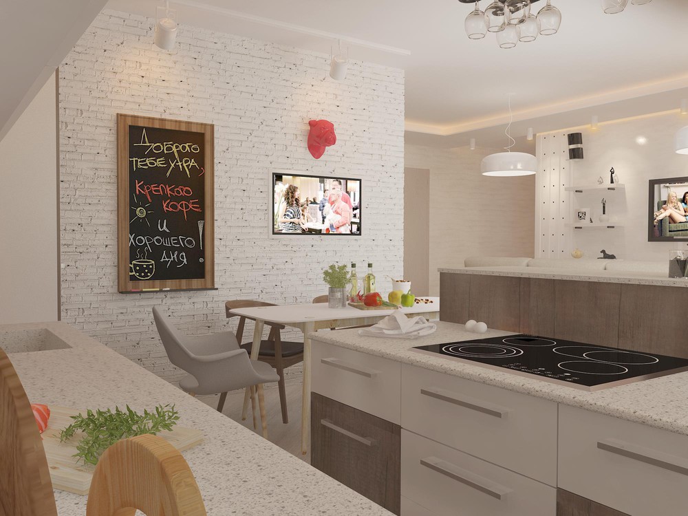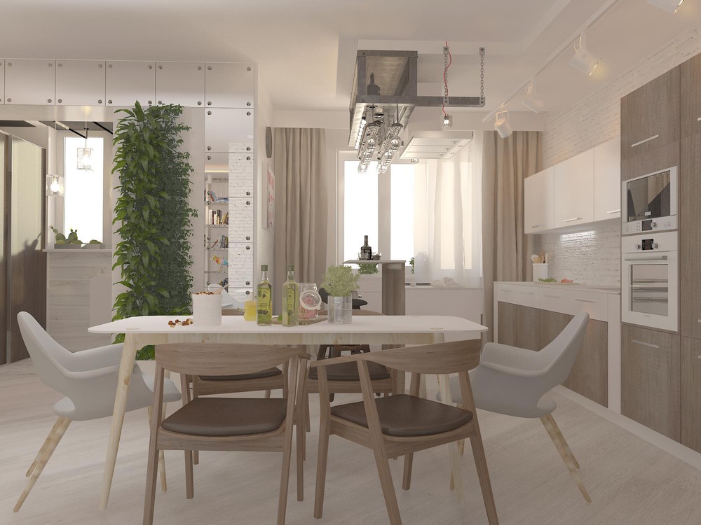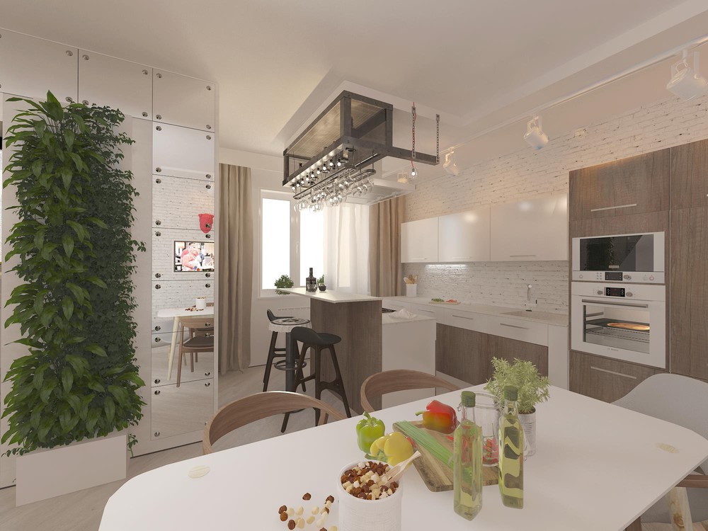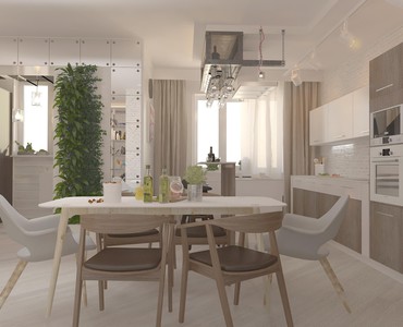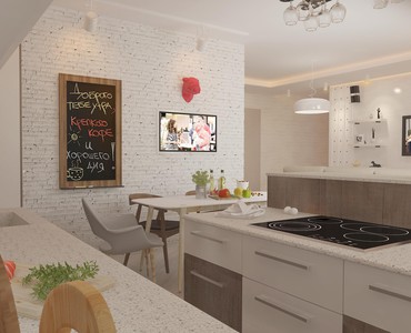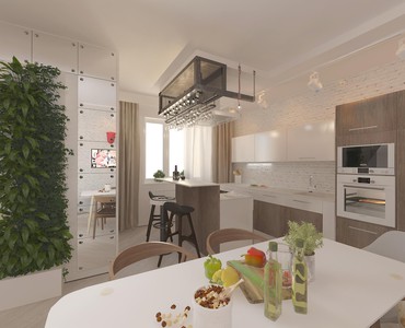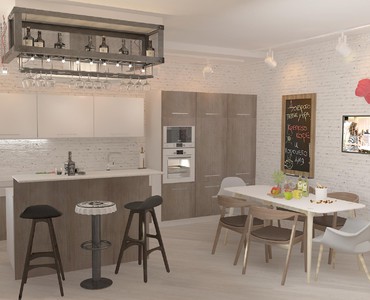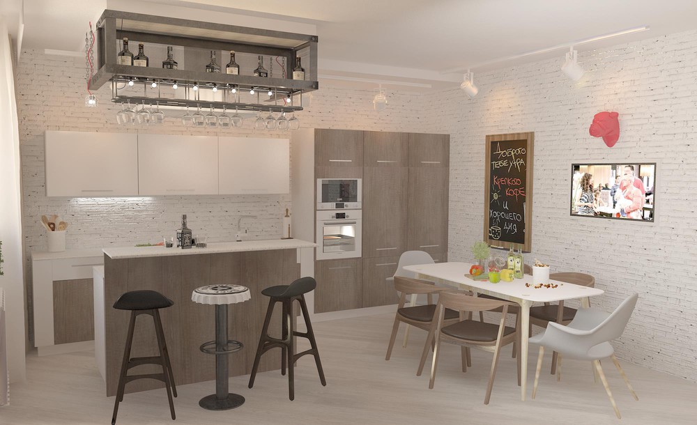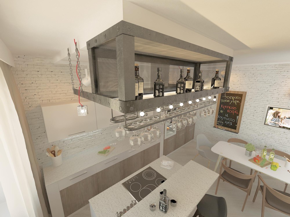 Помещение кухни в проекте трехкомнатной квартиры, выполненном для молодой семейной пары, включает в себя зону для приема гостей, балконную зону с кладовой комнатой, а также, по традиции, обеденную зону. Подвесная конструкция бара из металла и металлической сетки, стала излюбленным объектом на кухне у хозяев этого уютного пространства.