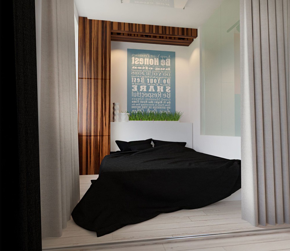 Проект квартиры-конструктора для молодой пары и троих детей. Стояла задача сделать грамотную перепланировку и разместить с комфортом на 60м2 пятерых человек. Пространство получилось насыщенным, динамичным и многофункциональным. Гостиная составляет единое пространство с коридором спальней, столовой зоной и кухней. Разделение происходит за счет стеклянных перегородок и штор. Детская предназначена для двух годовалых двойняшек и девочки 10 лет, комната зонированная на две части, общая зона – это зона игрового пространства.