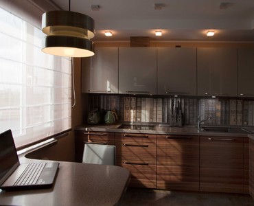 Кухня в типовом панельном блоке. В результате реконструкции удалось объединить кухонную зону и часть гостиной, превратив ее в столовую. Три с лишнем метра фронта и отдельный встроенный блок. Все на своих местах и под рукой, ничего лишнего.