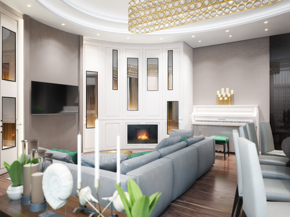 Проект квартиры в ЖК "Садовые Кварталы". Просторная квартира с большими окнами от пола до потолка, из которых открывается прекрасный вид. Кухня соединяется визуально и отделяется функционально со столовой зоной и гостиной большими окнами. В гостиной установлен камин Dimplex Очаг Opti-Myst Tahoe, в спальне Dimplex Очаг Opti-Myst Redway. Дизайн-Алина Штейн, визуализация-Легчатов Илья