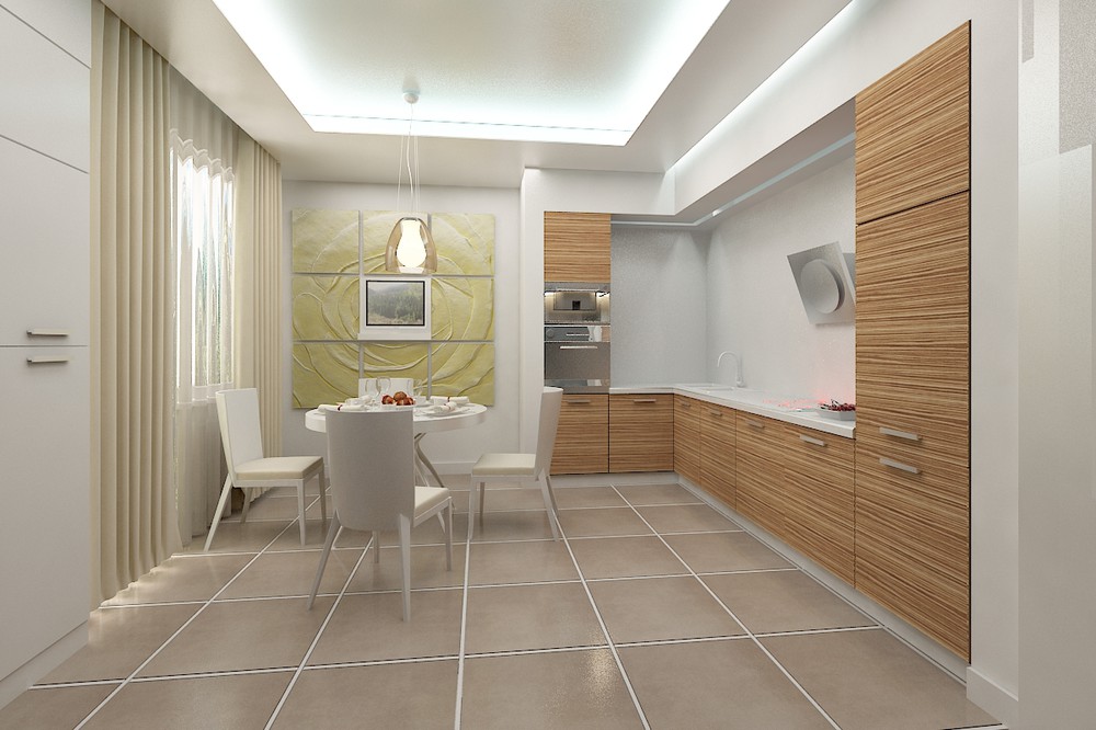 Кухня получилась достаточно просторной. Почти вся техника расположилась в шкафах-колоннах на торцах композиции в нише. Изначально кухня планировалась без верхних шкафов по пожеланию заказчиков были добавлены несколько шкафов с сушкой. На противоположной стене расположился большой встроенный в нишу шкаф. Функционально стояла задача разделить кухню и гостиную. Тем не менее, чтобы придать легкость интерьеру было решено отделить их с помощью четырехстворчатой раздвижной перегородки, напоминающей кружево. Эта конструкция была выполнена на заказ из прозрачного закаленного стекла с матовым пескоструйным рисунком. Флористический узор перегородки, получил продолжение в рисунке на 3D панелях, а также мебельной обивки и шторах в гостиной. Таким образом, два смежных помещения были визуально объединены общим декоративным мотивом.Фотограф Александр Камачкин.