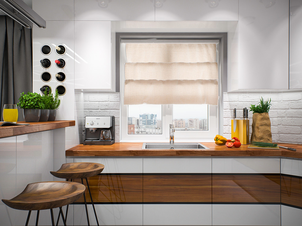 Квартира для молодой пары в Самаре. Встречает гостей данной квартиры очень необычная ломаная деревянная стена. Акцентом в кухонной зоне является живая стена. Интерьер Выполнен с применением экологических материалов дерева и зелени. Использование одного материала (ламината) на полу и стене позволяет визуально продлить, расширить обеденную зону.