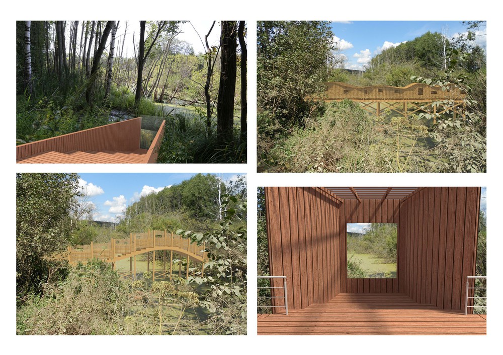 Малые архитектурные формы для болотного парка рядом с Николо-Ленивцем. Различные видовые точки: мост с окошками, подъем - смотровая площадка, два вида уединения с природой - гнездо и шалаш, спуск "в болото".