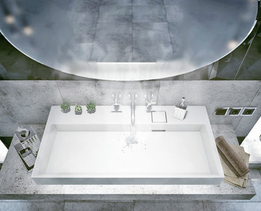 Просторное помещение с необычной архитектурой с большими окнами, интересным сочетанием материалов и фактур в дополнении с сантехникой от Jacob Delafon. Ванна коллекции LOVEE, напольный смеситель STILLNESS подвесной унитаз и раковина из коллекции TERRACE.