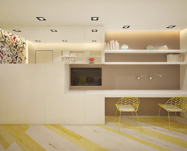 Детская для двух девочек: 8 и 10 лет. Главная задача, которая стояла перед дизайнером - как наиболее функционально расставить мебель, организовать места хранения, рабочие места, сохранив ощущение простора. Деление небольшой комнаты на зону отдыха и рабочую зону весьма условное, при этом здесь обеим девочкам созданы одинаково комфортные условия. Желтый цвет напольного покрытия в этом интерьере выбран не случайно, он как солнечный лучик, везде проникает и согревает, особенно в пасмурные дни. Ощущение легкости, воздушности, глубины и радости интерьеру помогли создать замечательные обои Eijffinger, коллекция Wallpower Wonders, великолепным дополнением к которым стали римские шторы и подушки из ткани Designers Guild, коллекция Amrapali и подушки из ткани Butterfly Parade от Christian Lacroix. НОМИНАЦИЯ 2. «Лучший 3D-проект интерьера с использованием обоев брендов Arte, Eijffinger, Guy Masureel, Hookedonwalls, Khlara, Khroma, Khroma Zoom по мнению жюри. НОМИНАЦИЯ 4. «Лучший 3D-проект интерьера с использованием обоев брендов Arte, Eijffinger, Guy Masureel, Hookedonwalls, Khlara, Khroma, Khroma Zoom по мнению посетителей (Приз зрительских симпатий)».