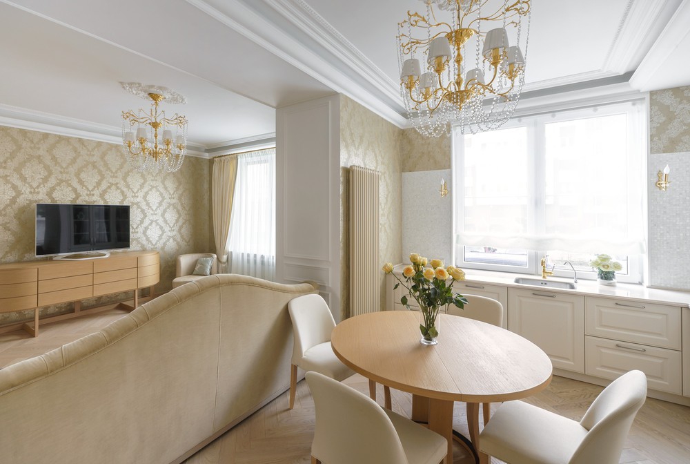 Благодаря использованию обоев брендов Arte и Khroma интерьер апартаментов получился легким, элегантным, воздушным и стильным. Заказчики не планировали жить в Калининграде постоянно, но результат им так понравился, что в итоге семья поменяла свои планы и переселилась на Балтийское побережье. Фотограф: Александр Шевцов.