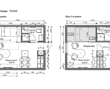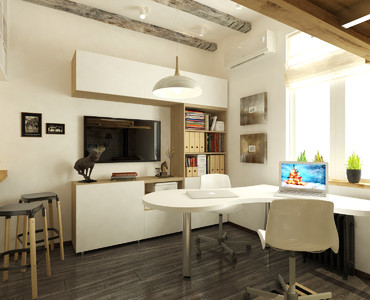 По пожеланию заказчика на данной площади необходимо было создать функциональное и комфортное пространство для проживания и работы 2-х человек. Было предусмотрено разделение пространства на условные функциональные зоны кухни, гостиной, рабочего пространства и зону спальни. Спальную зону с полноценной кроватью, а также зоны хранения вещей разместили на втором уровне. В зоне отдыха комфортно расположены печь на дровах и раскладной диван для гостей. Рабочая зона расположена в центре комнаты, что обеспечивает к ней комфортный доступ. Кухня от рабочей зоны отделена барной стойкой и шкафом для хранения вещей. Интерьер выполнен в светлых тонах в стиле лофт с использованием акцентов из бетона и кирпича.