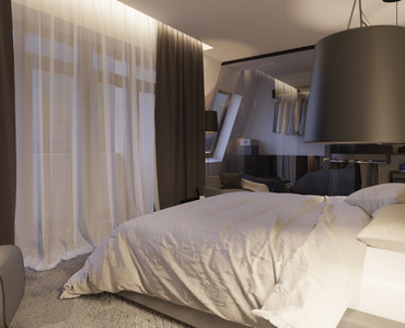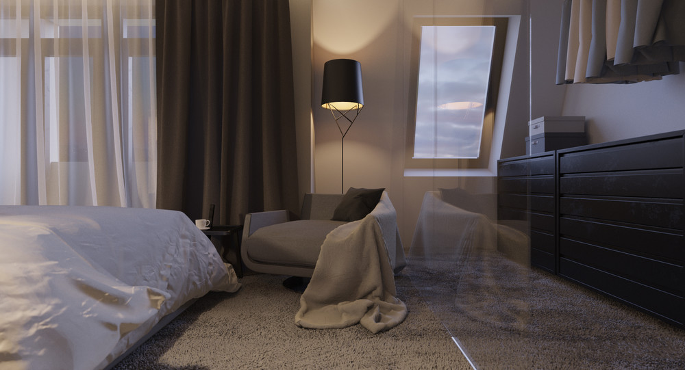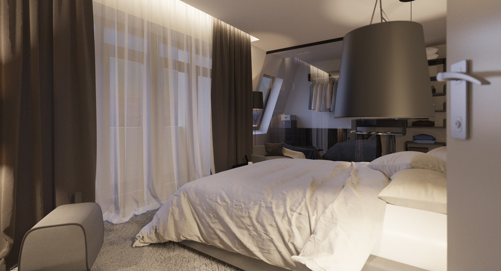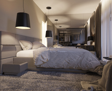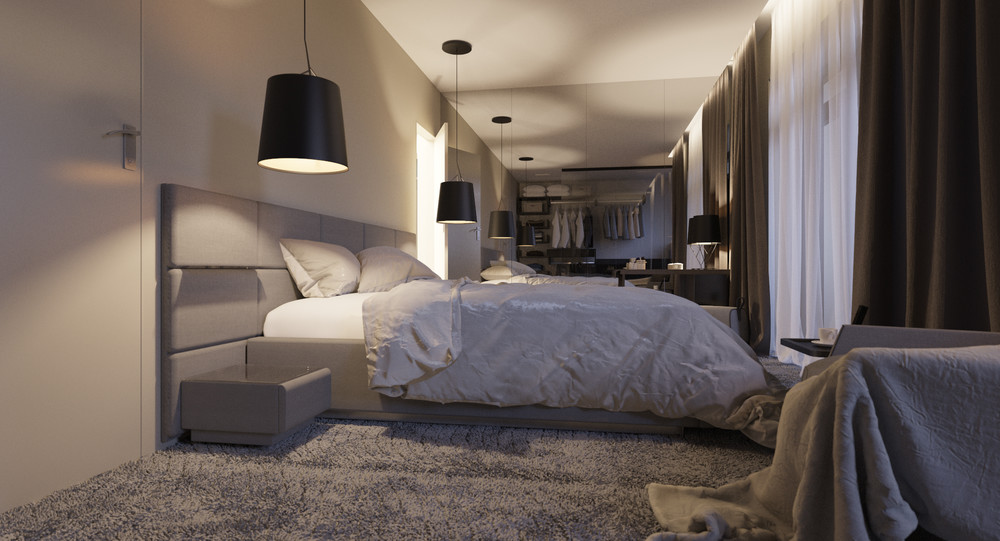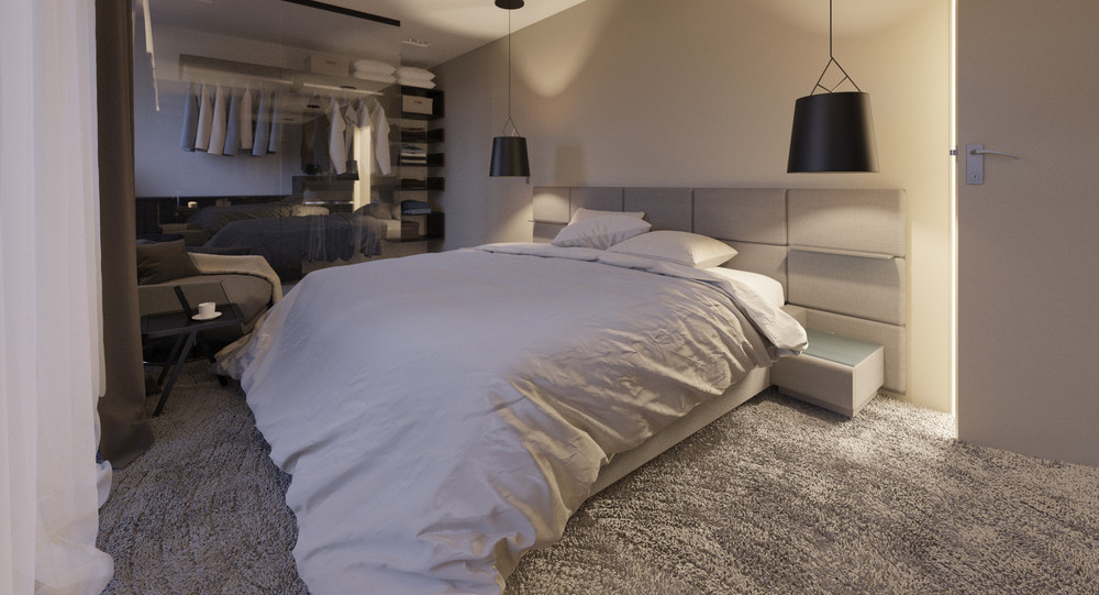 Спальня нейтральных тонов в апартаментах в стиле Urban, с низкой кроватью Dreamland (Сицилия). В интерьере этой спальни мы постарались создать общее ощущение мягкости, уюта, "светлого кокона", сочетая фактуру и текстиль нейтральных и светлых тонов, мягкую мебель, средневорсовой ковер и приглушенное освещение. Убаюкивающая мягкость прикосновения во всем.