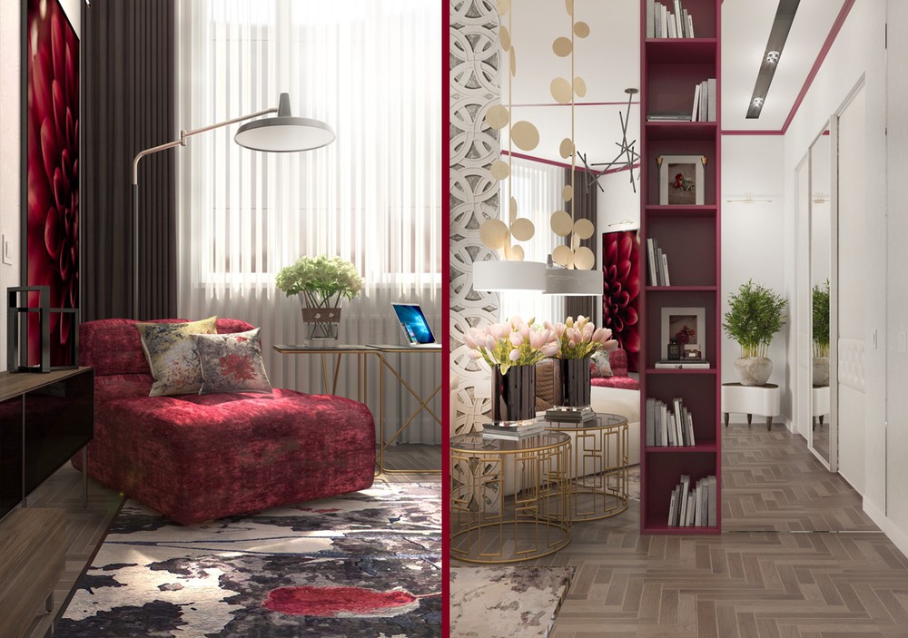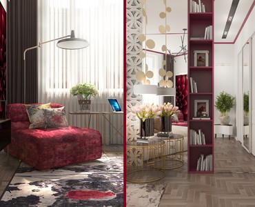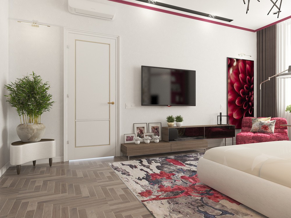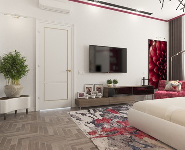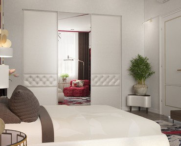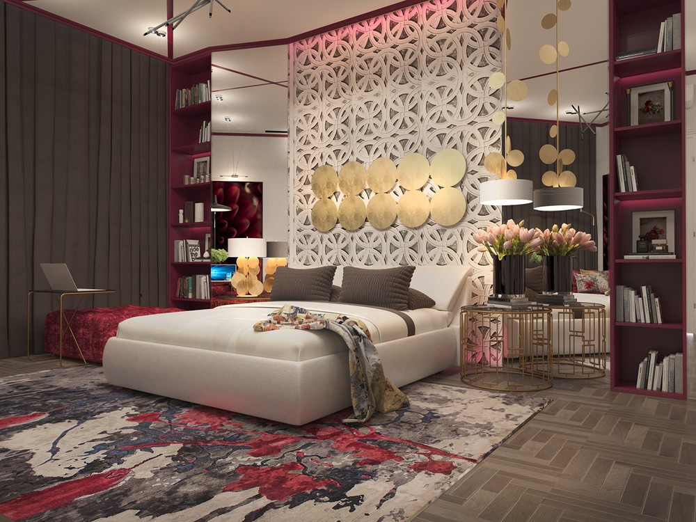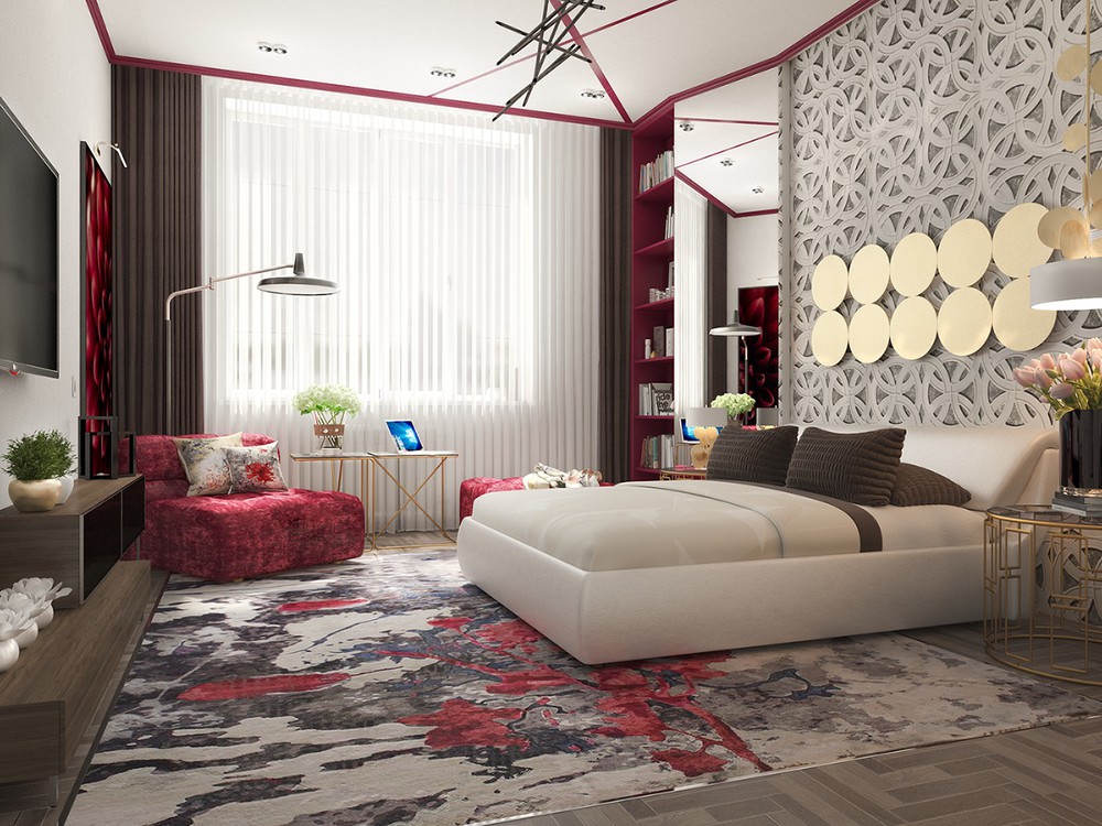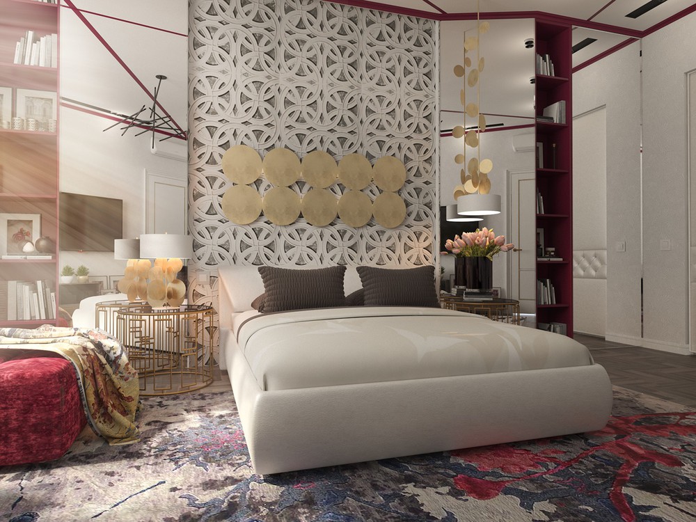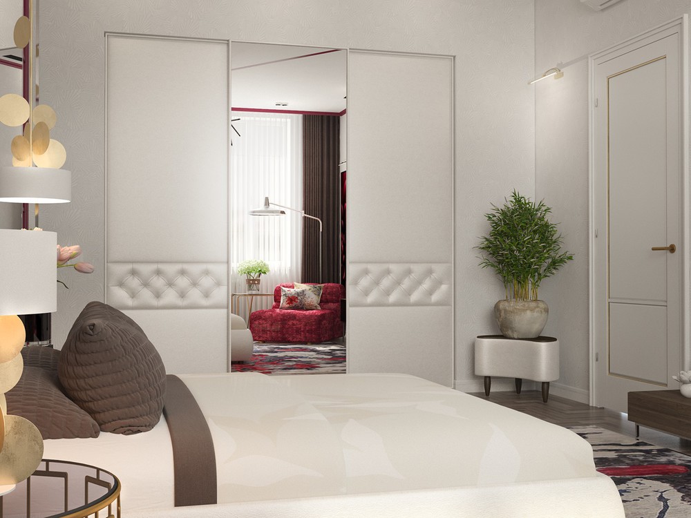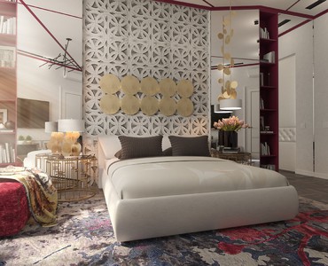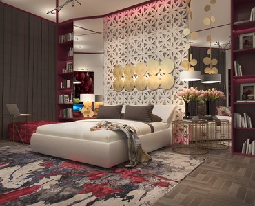 "Стильная, яркая, в меру дерзкая, утонченная, бескомпромиссная, элегантная, интригующая...". Именно такая хозяйка этой спальни, поэтому и сам дизайн был создан ей под стать. В проекте была использована мебель компании Dream Land: кровать Bali-2, банкетка Ontario и шкаф Dolores.