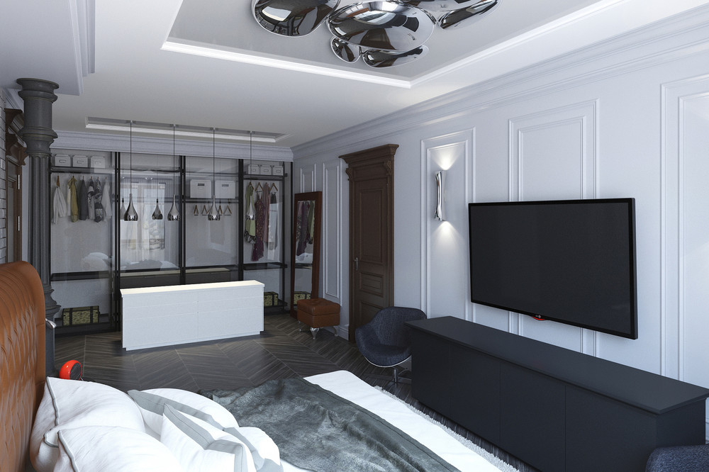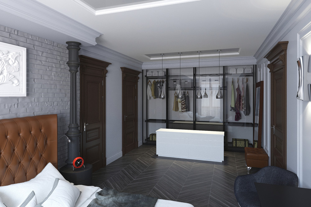 Проект спальни для молодой пары в загородном доме в Ленинградской области. Воплотить мечту заказчиков помогли предметы мебели от компании Dream Land: кровать Вирджиния и банкетка Монтсеррат, выполненные в коже Samoa Aurora Wood.