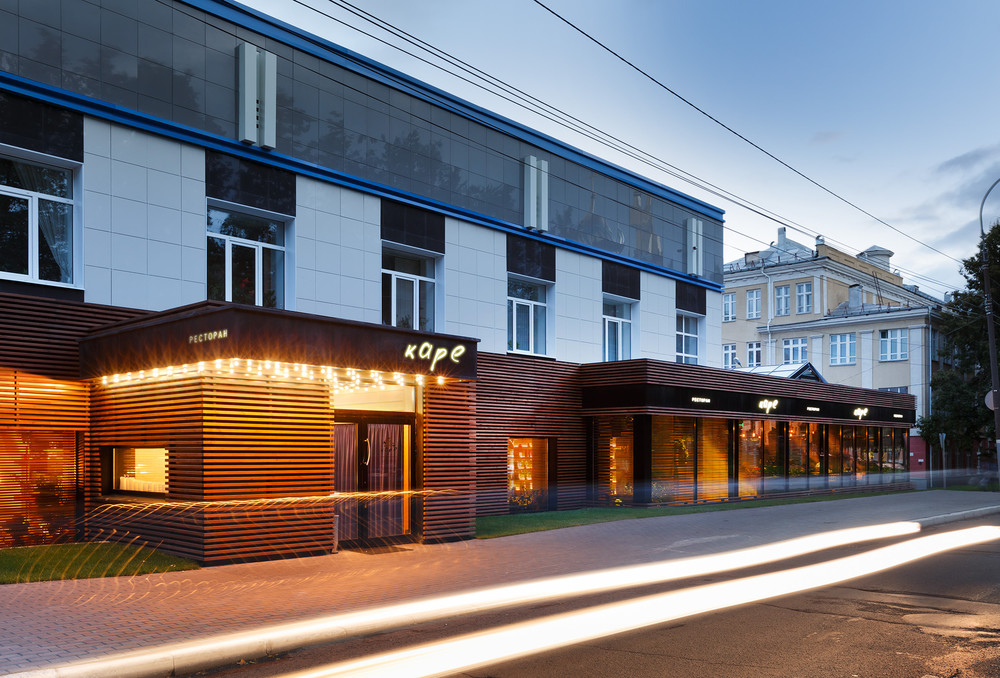 Фасад ресторана «Каре». К основному объему здания бывшего банно – прачечного комбината пристроено дополнительное сооружение, где размещена Входная группа и гардероб. Фасад облицован рейками из лиственницы.