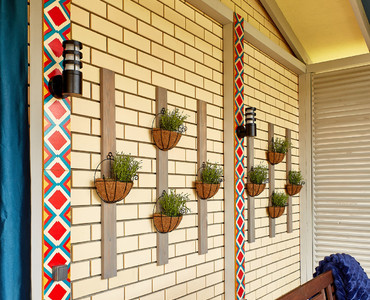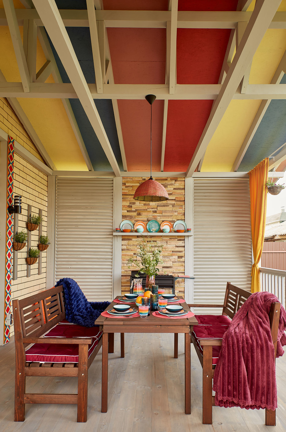 Проект террасы выполнен в рамках программы "Фазенда Лайф". Основная задача - вписать смелый авторский взгляд на террасу, создав нечто самобытное и в то же время прекрасно дополняющее образ основной постройки-дома. Яркие цвета потолка уравновешены спокойным серым оттенком пола. Классическую садовую деревянную мебель разбавили яркими креслами-мешками. "Мексиканский" орнамент на декоративных элементах соседствует с композицией из лаванды, высаженной в настенные кашпо. На балках же террасы предусмотрели подвесные кашпо, в которые поместили одну из разновидностей гибридной ампельной петунии – калибрахоа. А традиционные деревянные ламели оттенены ультрамодными цветными стеклоблоками. Год реализации 2021.