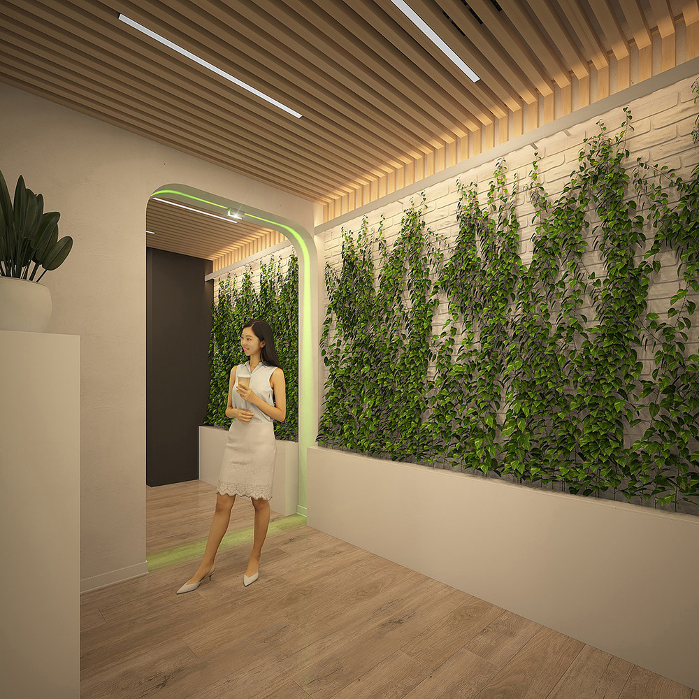 Перепланировка помещения первого этажа под офис компании. Для комфортной жизни сотрудников офис оснащён кухней с обеденной зоной. Коридор пересекающий всё пространство и тянущийся от начало до конца всего помещения облагорожен стеной из живых растений (Лиана). Зелёная стена имеет капельный полив выведенный в ящики установленные на пол. Для удобства вертикального роста вьющихся растений, стены отделана декоративным камнем, что позволит побегам легко цепляться за выступы на стене. Зона рецепции и кабинеты декорированы настенными кашпо закреплёнными чуть ниже потолка. Все растения подсвечены линейными светильниками, свет от которых позволит им чувствовать себя очень комфортно на протяжения всего светлого периода дня находясь в помещение. Обеденная зона также выдержана в единой стилистике всего пространства. Стены декоративны обоями – Wall Street (VETVE 21) в зелёной гаме которые позволяют войти зеленому коридору в глубь кухонной зоны, что создаст пространство природы внутри замкнутого объёма без доступа дневного света. Концептуальное решение офисного пространства – «Природа внутри бетонных стен».