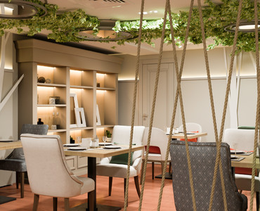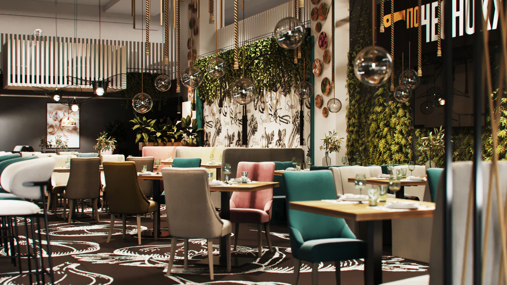 Объединяющими деталями стали фирменные паттерны на стенах и на полу и обилие зелени, авторских изделий керамической мастерской, натуральных текстур дерева, пеньки, стекла и металла.
