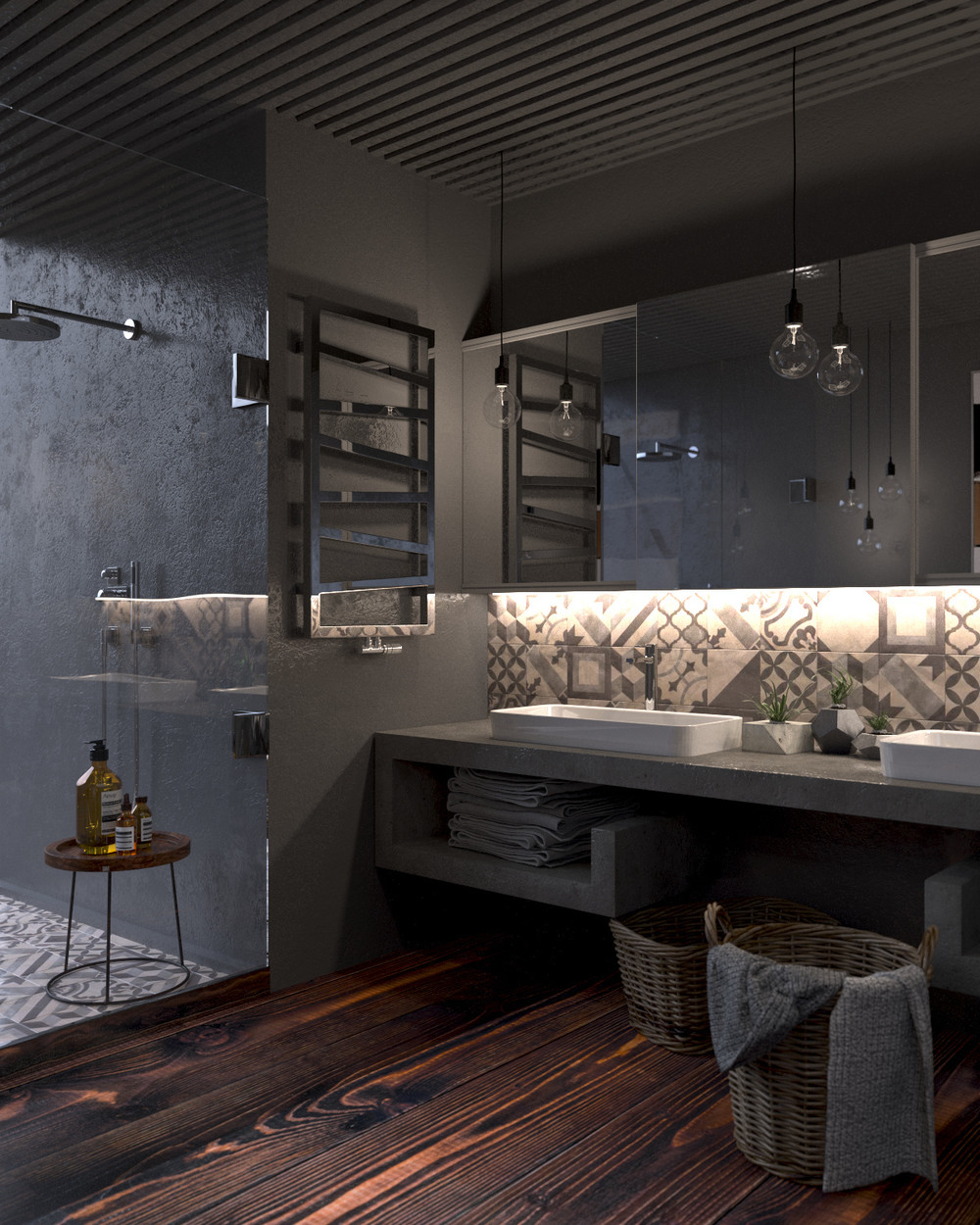 Полное спокойствие и уравновешенность, спокойные нейтральные цвета, изысканные формы, приятные фактуры, четкая геометрия и минимализм,уют и функциональность, традиционное, эргономичное расположение сантехники, мебели и аксессуаров. Картина художника Pierre Soulages гармонично вписывается в интерьер. В данной работе была использована раковина BETTEART фирмы BETTE, аксессуары для ванной (ёршик и держатель туалетной бумаги Loft) фирмы EMCO и клавиша смыва LOOP фирмы TECE.