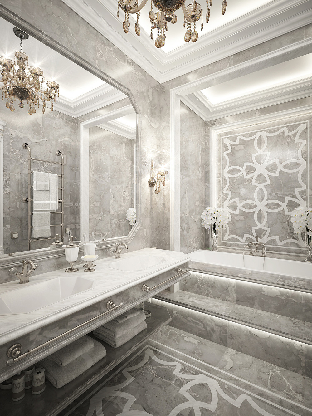 Проект ванной комнаты в жемчужно-серых тонах. Общее пространство ванной комнаты поделено на зоны: напротив входа располагаются 2 раковины и большое зеркало, рядом в подиум встроена роскошная ванна на двоих Villeroy & Boch из коллекции My Art (1800 x 800 mm) с системой гидромассажа, в отдельном помещении размещаются душевая, а также унитаз и биде из серии Sentique. Проект находится на стадии реализации.