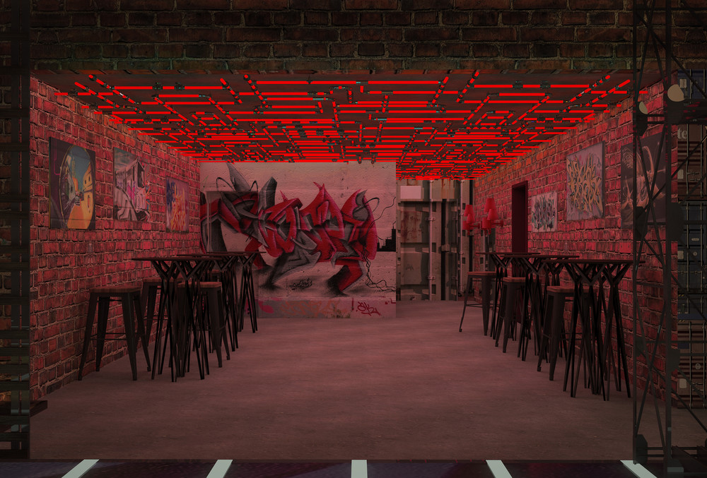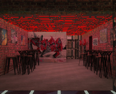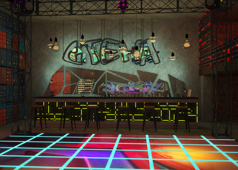 Ночной клуб «Стена» - это концептуальный проект. Клуб располагается в отдельно стоящем здании площадью 300 квадратных метров. Он рассчитан на молодую и заводную аудиторию. Это место придётся по душе не только тем, кто любит танцевать в стиле Street Dance, но и обычным танцорам. На ярком танцполе место хватит всем, а цветные прожекторы выделят самых заводных. Если захочется передохнуть, можно устроится за барной стойкой, откуда видно весь зал. Так же внизу есть диваны со столиками, на которых может расположиться большая компания, места хватит всем. А если захочется перекусить и остаться вдвоём, то на втором этаже посетителей ждут удобные кресла со столами. И оттуда так удобно наблюдать за танцующими. Кирпичные стены с нарисованными на них граффити, постеры, висящие тут же. Металлическая и деревянная мебель, с подсветкой. Хромированные перегородки и трубы вместо обычных светильников. Интересные лампы, напоминающие грибы или светлячков. Оригинальное решение танцпола, картинку которого можно увидеть только сверху, и то лишь на несколько секунд, ведь она постоянно будет меняться. Стойка диджея, расположенная, таким образом, чтобы ему никто не мешал. Множество обманных стен и парящая лестница. Всё это и создаёт общую атмосферу клуба, выполненную в стиле лофт.